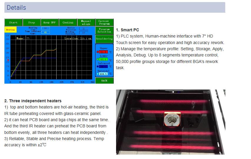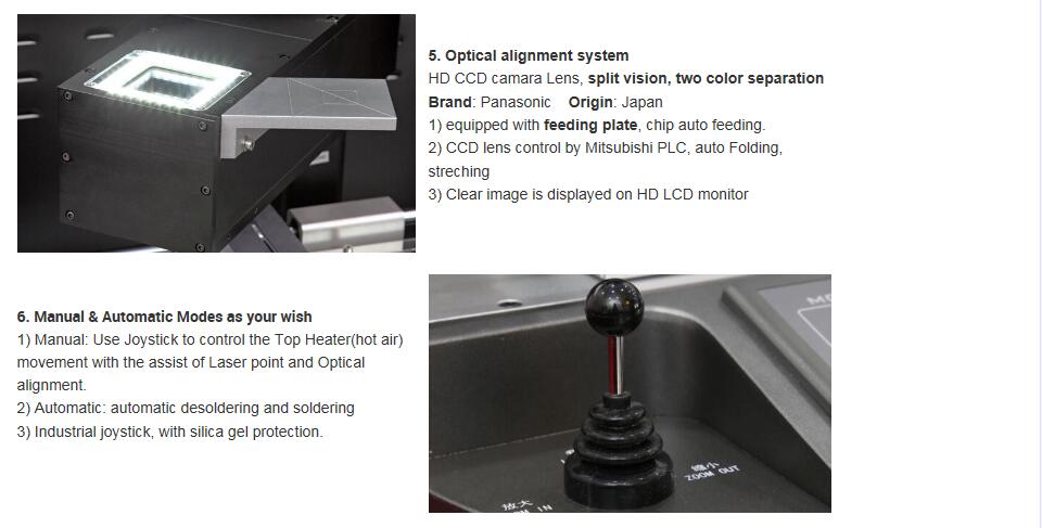 * HD CCD optiskās izlīdzināšanas sistēma precīzai BGA un komponentu montāžai. CCD objektīva automātiska saliekšana un strečings.